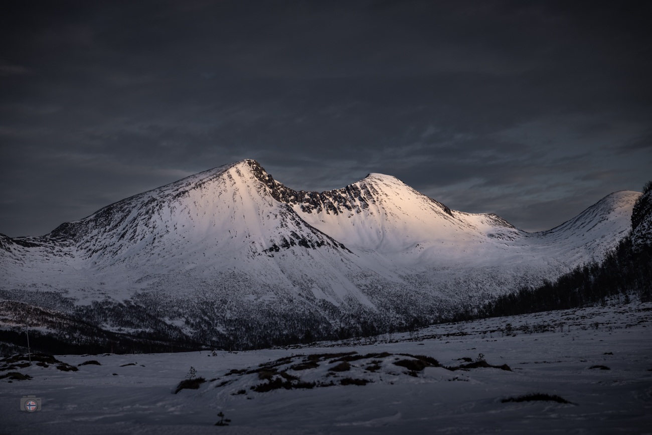 Später legte ich die Ski ab. Der Untergrund war komplett gefroren, hart und glatt. Jeder Schritt klang auf dem Eis. Die Landschaft war reduziert, fast grafisch. Die Berge standen im ersten Licht des Tages. Der Sonnenaufgang kam langsam. Die Gipfel fingen das Licht, während das Tal noch im Schatten lag. Nichts bewegte sich.